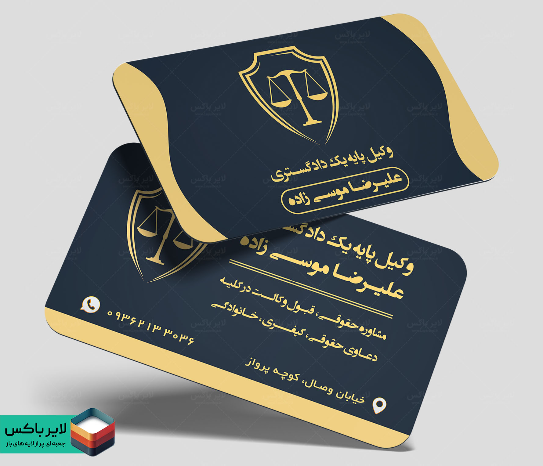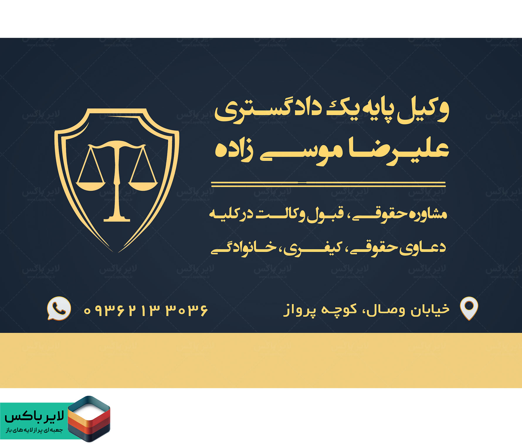 با این کارت ویزیت لایه باز وکالت، تصویری معتبر، حرفهای و قابل اعتماد از خدمات حقوقی خود ارائه میدهید؛ طرحی که در نگاه اول حس تجربه، تخصص و اطمینان را به مخاطب منتقل میکند.