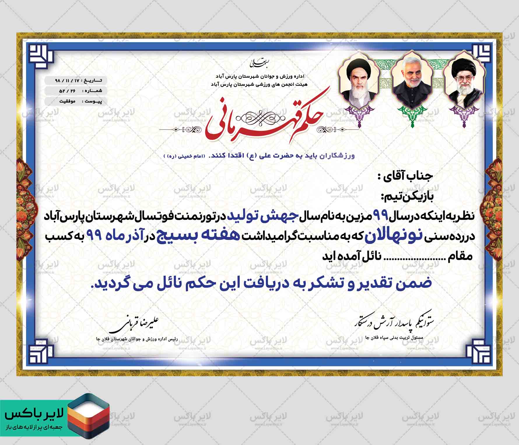 با این حکم قهرمانی لایهباز میتوانید تنها با جایگزینی اطلاعات موردنظر، در کوتاهترین زمان یک حکم رسمی، زیبا و آماده چاپ برای تقدیر از قهرمانان تهیه کنید.