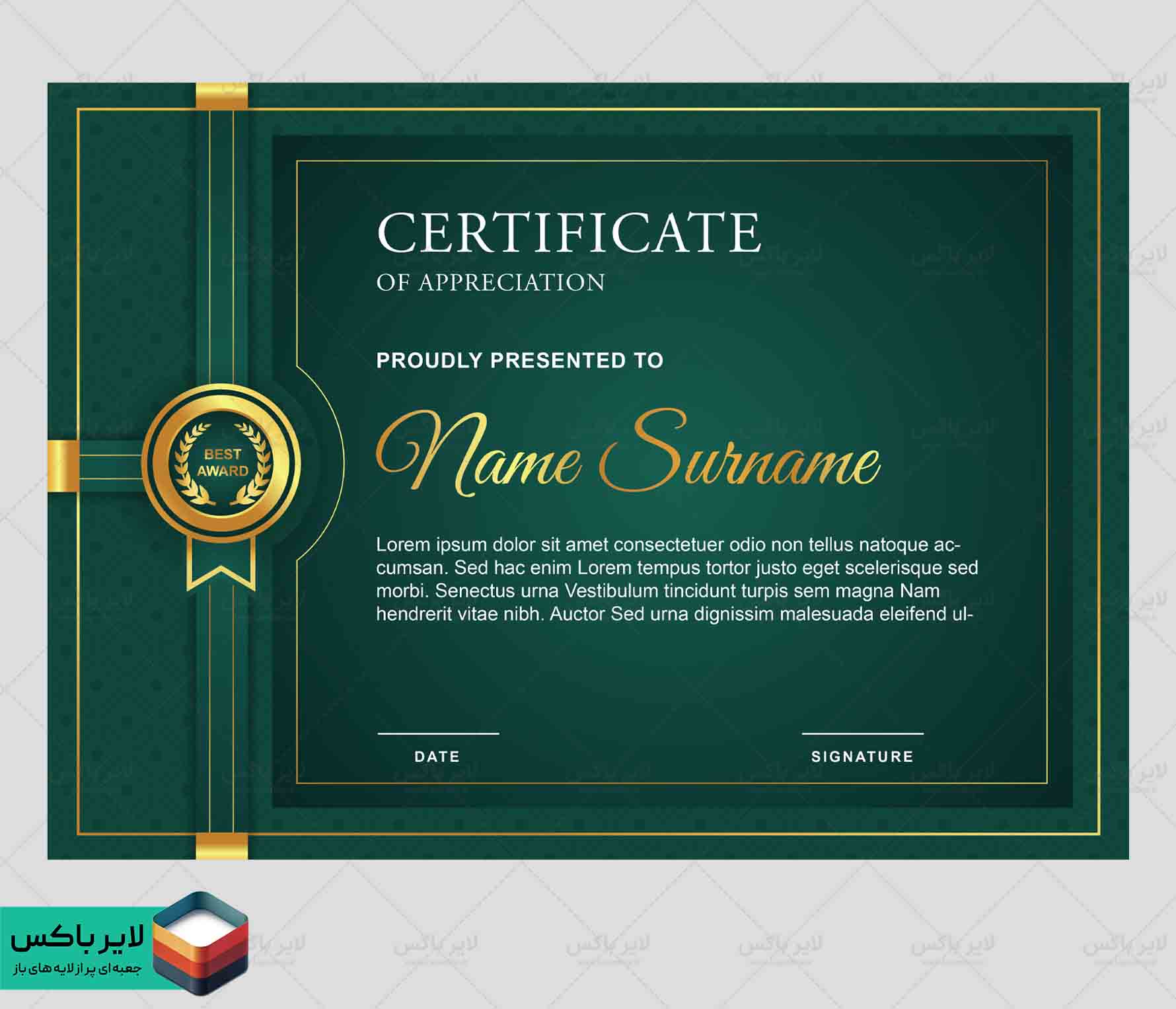 سرتیفیکیت آموزشی با ترکیب خانواده رنگهای سبز و خطوط گرادیانت طلایی | طراحی لوکس و چشمنواز