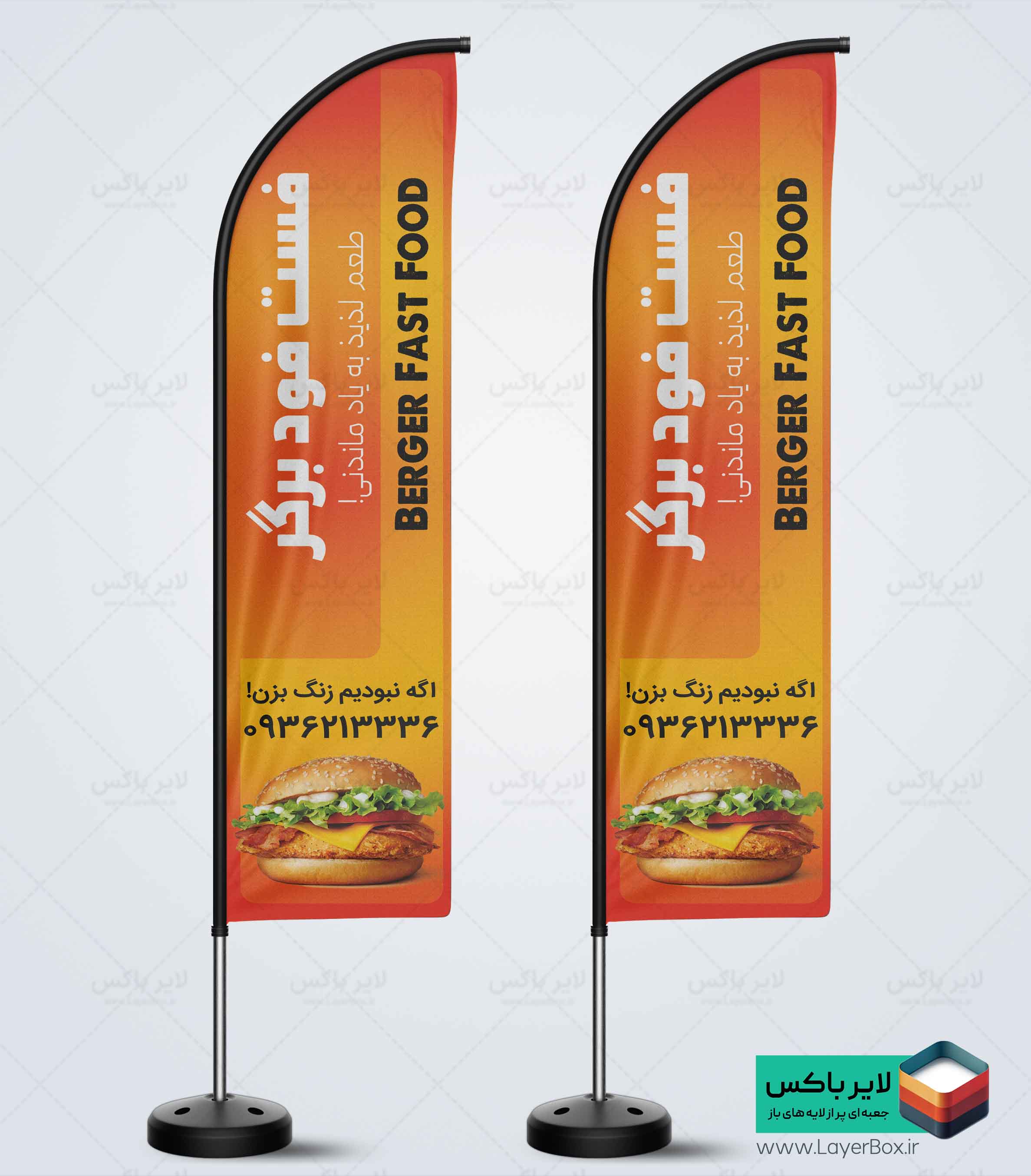 فایل لایه باز پرچم بادبانی فست فودی دارای عکس همبرگر
