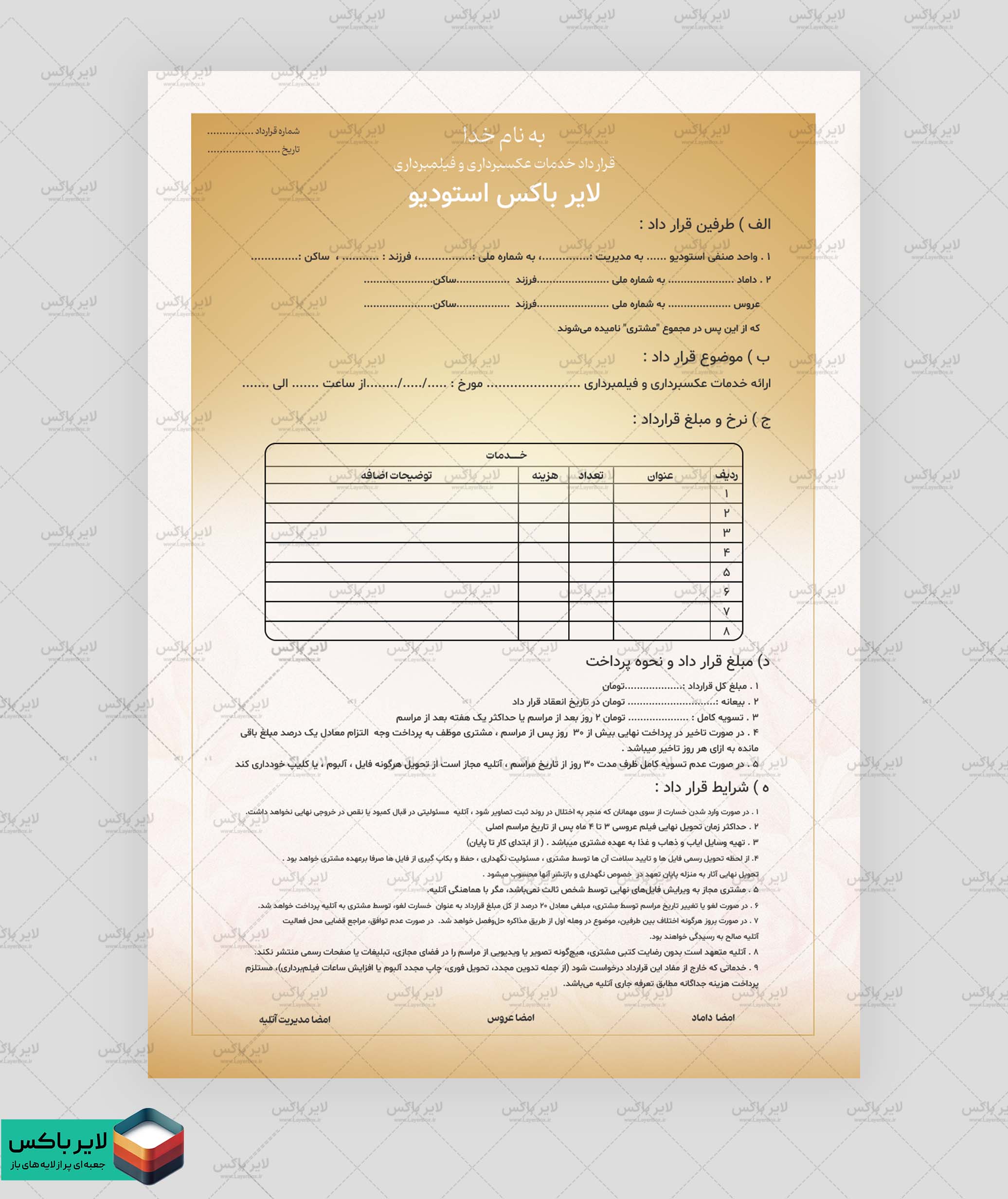 فایل قرارداد در فرمت PSD ارائه میشود و امکان ویرایش کامل در نرمافزار Photoshop را دارد. شما میتوانید بهراحتی نام استودیو، شرایط پرداخت، تعهدات طرفین، مدت زمان تحویل عکس و فیلم، هزینهها و سایر موارد را شخصیسازی کنید.