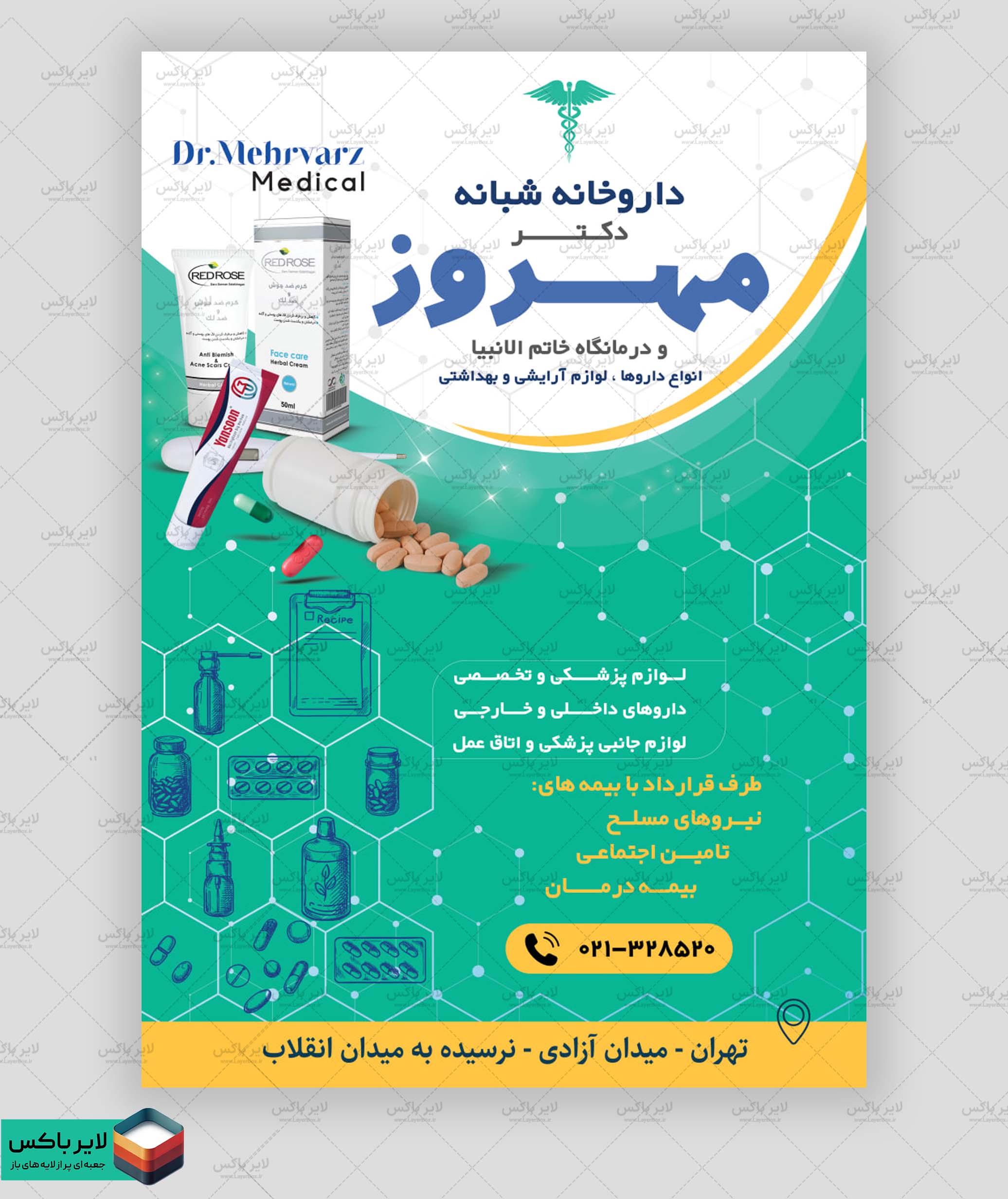 پوستر لایه باز داروخانه – طرح حرفهای PSD برای بنر، تراکت و تبلیغات دارویی