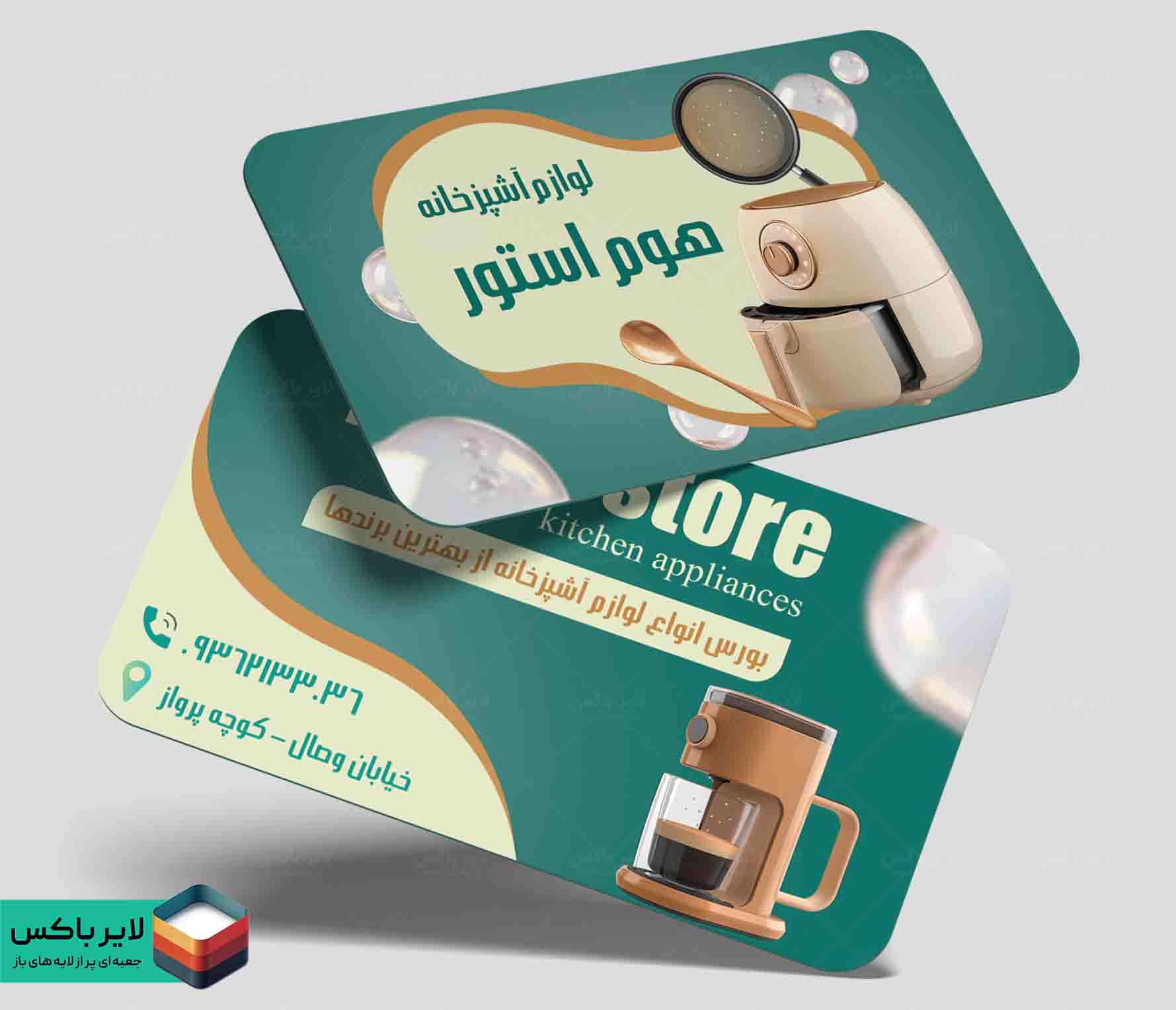 کارت ویزیت لایه باز لوازم آشپزخانه – طراحی شیک برای فروشگاههای لوازم خانگی و آشپزی